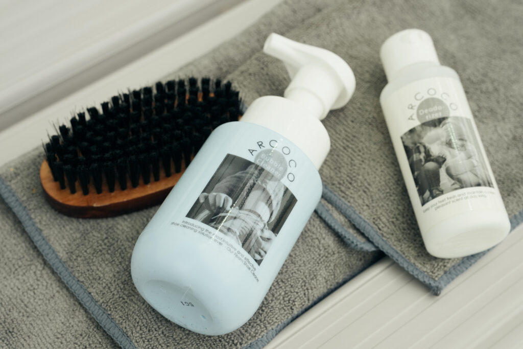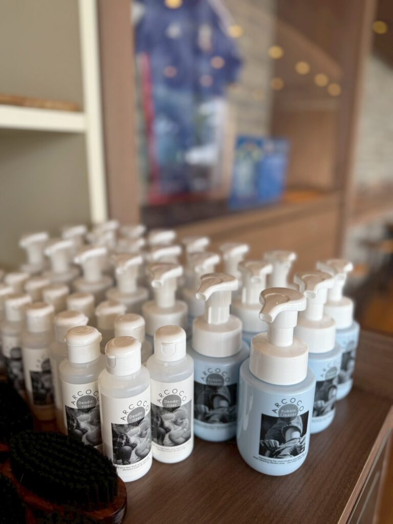 ARCOCOバブルクリーナーは、お出かけ前にいつでも気軽に使用できるように、シューズラックにも収納しやすいポンプボトルを採用しました。